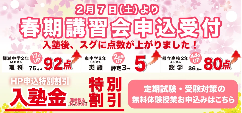 東所沢校で体験授業を行います。体験授業では、お子さんの勉強方法を把握し、塾の雰囲気、成績の上がる勉強方法などをお伝えします。
